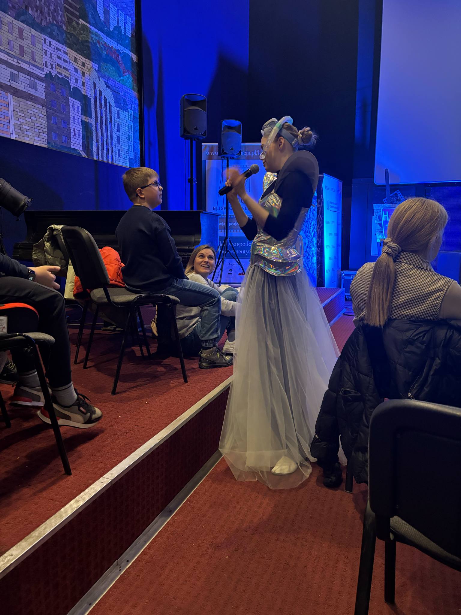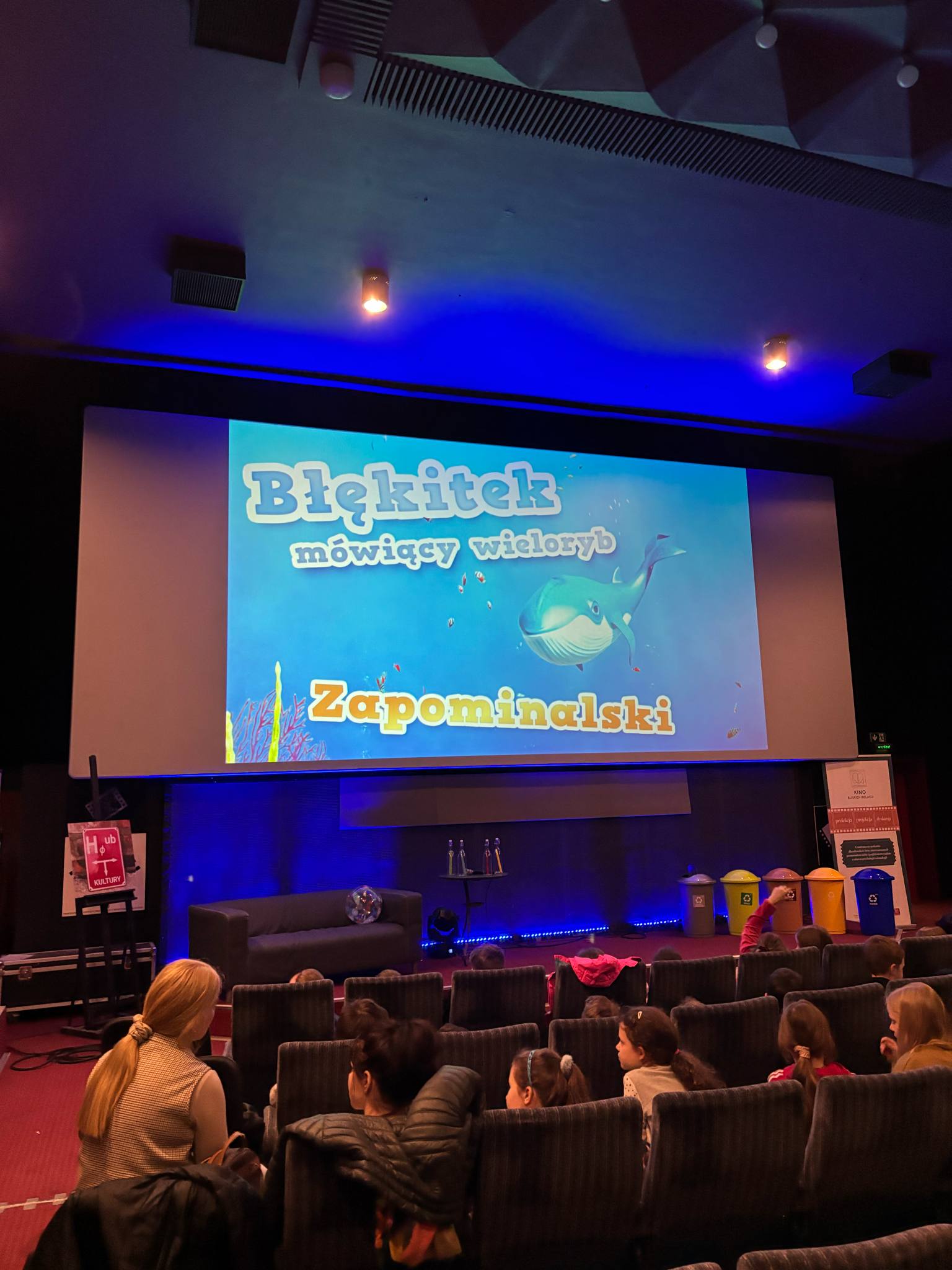 24 marca wzięliśmy udział w interaktywnym przedstawieniu teatralnym pt. „Błękitek – mówiący wieloryb”. Na początku spektaklu staliśmy się naukowcami i nawiązaliśmy połączenie multimedialne z Oceanem. Widząc, co dzieje się w głębinach rozmawialiśmy z wielorybem wykonując jego zadania i rozwiązując różne zagadki. Przedstawienie było pełne humoru i nagłych zwrotów akcji, zawierało elementy edukacyjne, poruszało temat ekologii.
