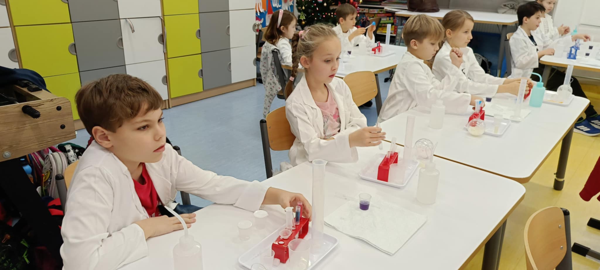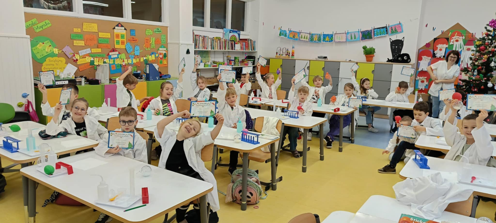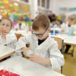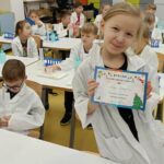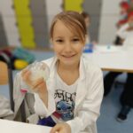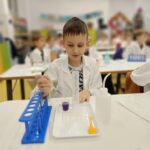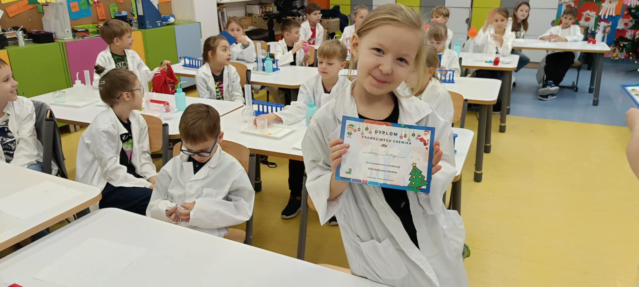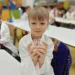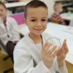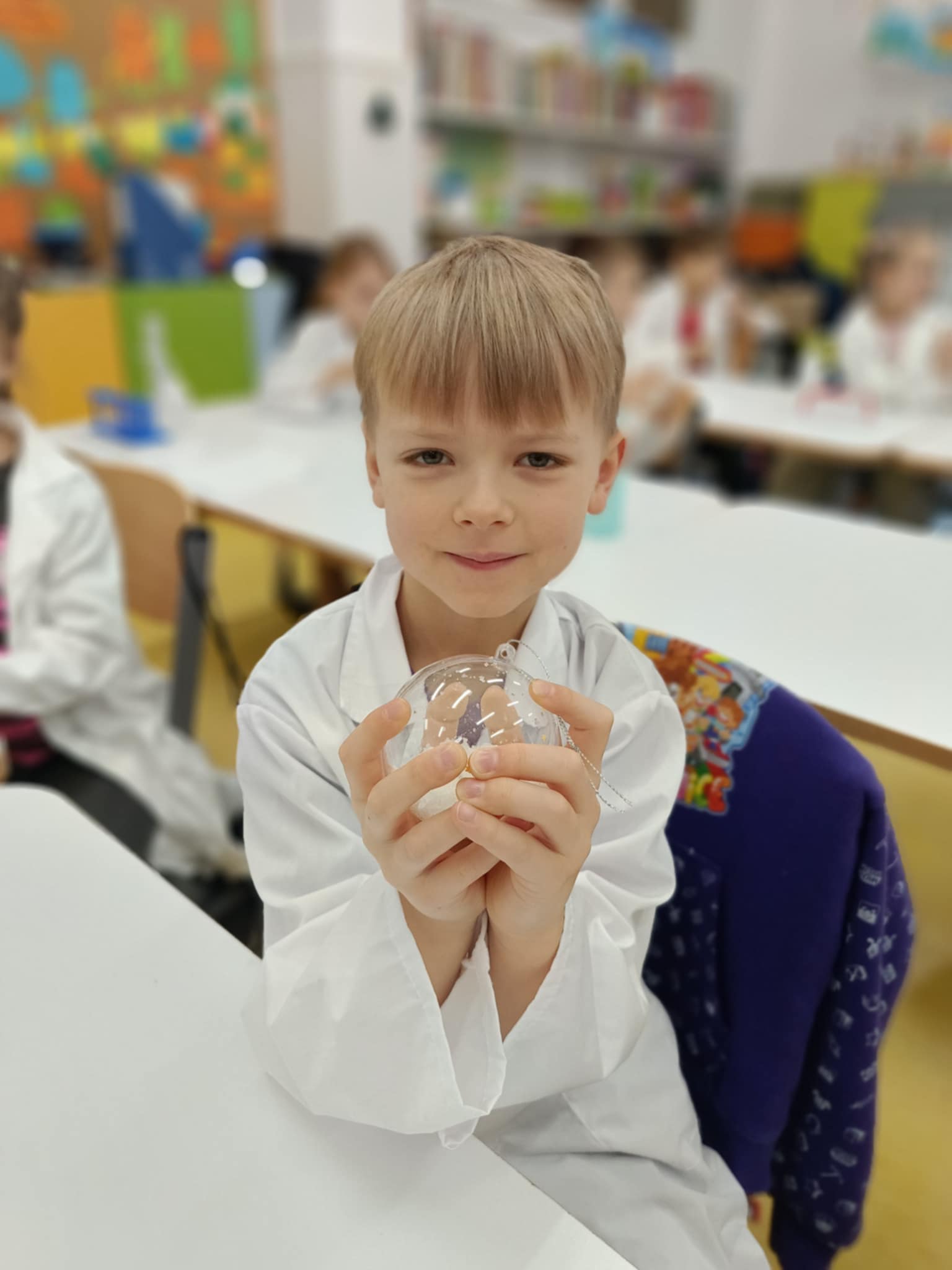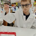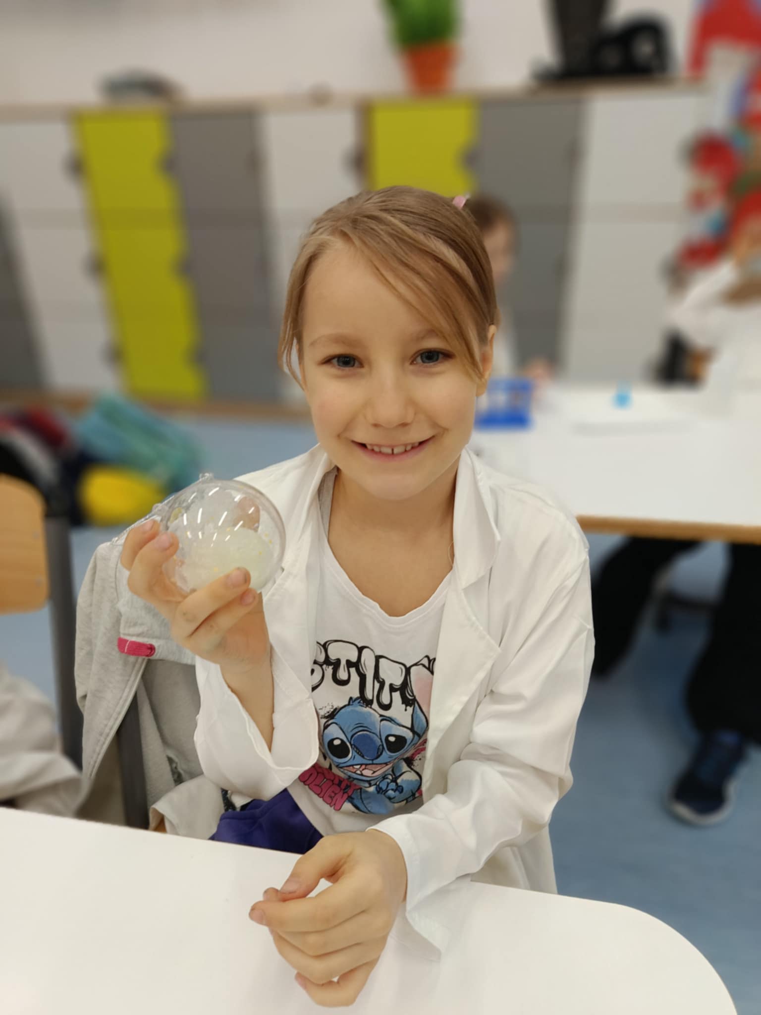 Tuż przed feriami mieliśmy okazję wziąć udział w kolejnych warsztatach chemicznych, tym razem związanych z zimą i okresem świątecznym. Po przygotowaniach stanowisk pracy, założeniu ubrań ochronnych przystąpiliśmy do eksperymentów. Każdy z nas miał swoje probówki i odczynniki, które posłużyły do wykonania kuli śnieżnej, elfowych eliksirów oraz magicznego balonika. Zaangażowanie małych chemików było ogromne, a zajęcia wzbogaciły nas dużą dawką wiedzy, umiejętności cierpliwości. Warsztaty poprowadziła pani Paula Kubicka, która z zawodu jest chemikiem i dzieli się swoją pasją z najmłodszymi uczniami. Bardzo dziękujemy!