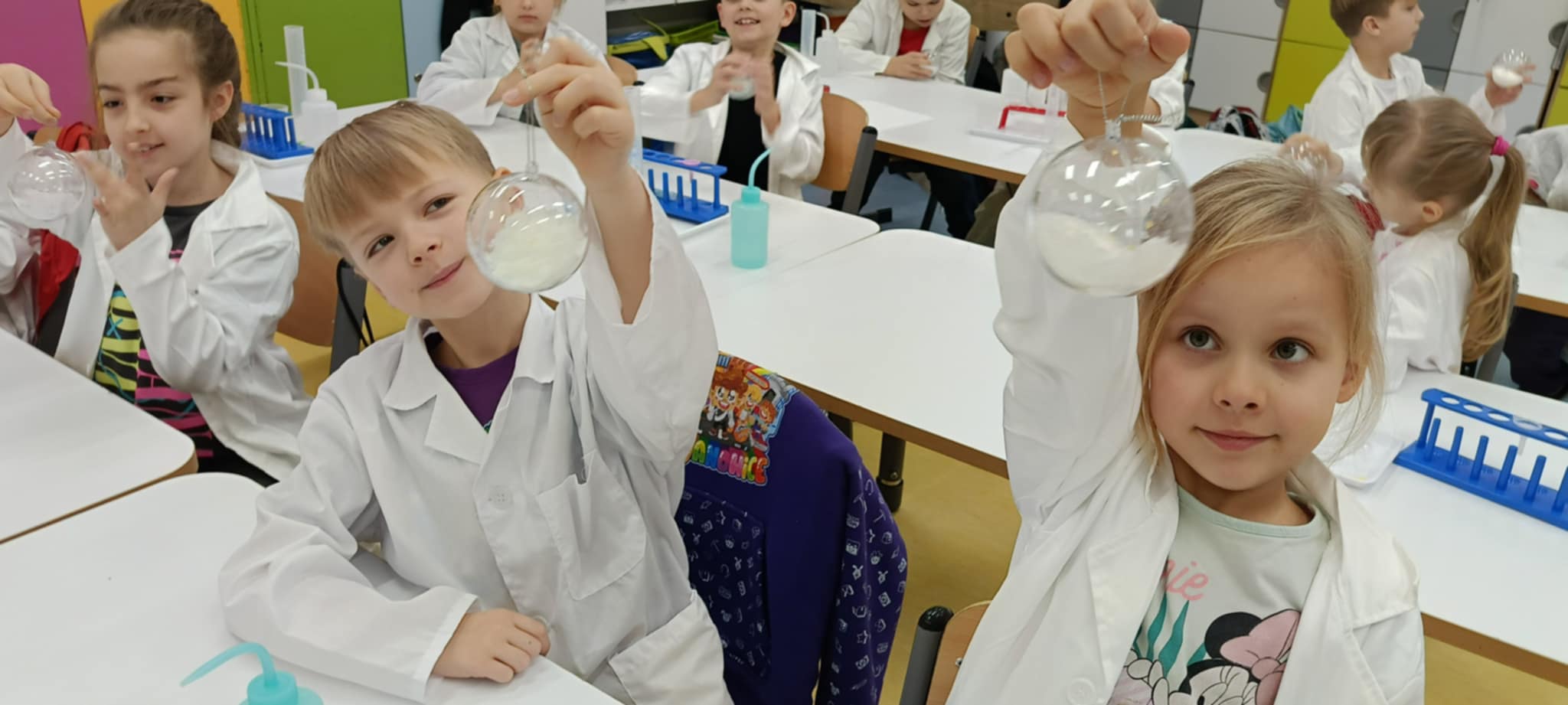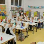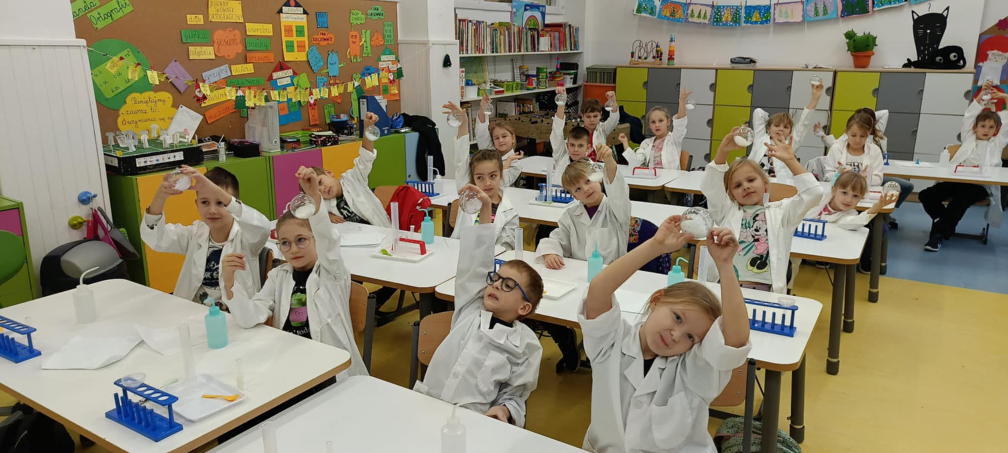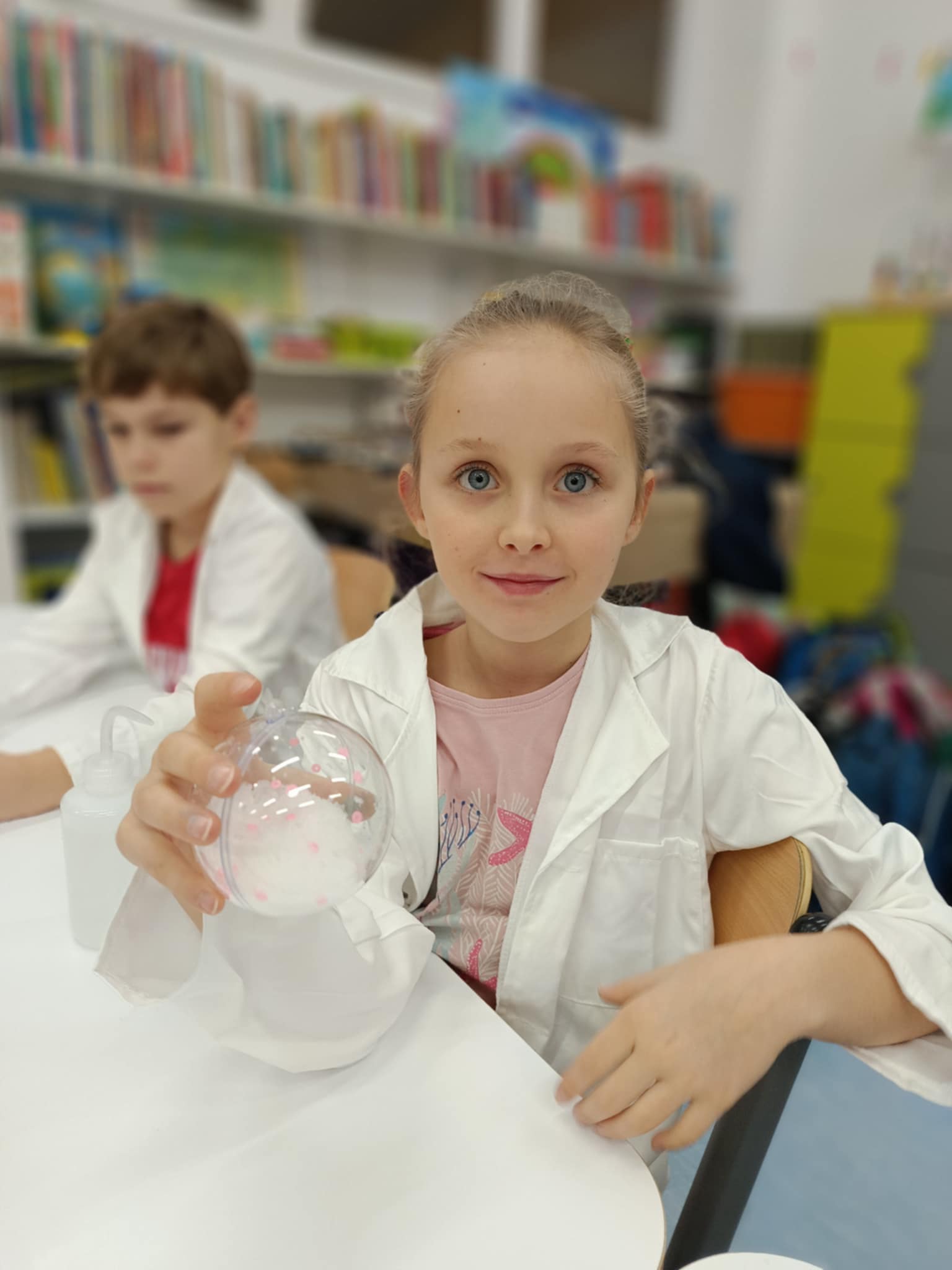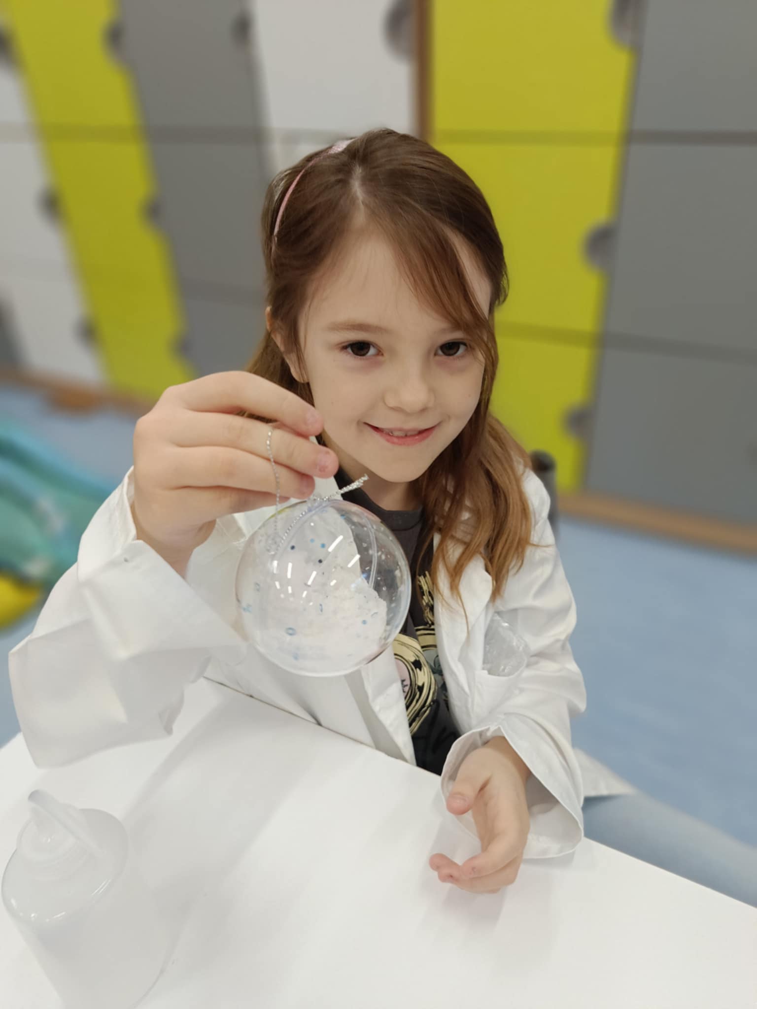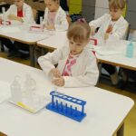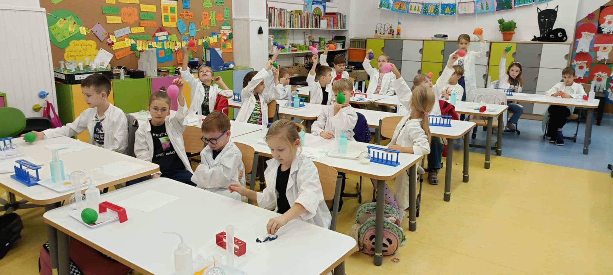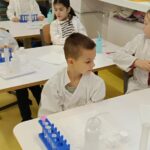 Tuż przed feriami mieliśmy okazję wziąć udział w kolejnych warsztatach chemicznych, tym razem związanych z zimą i okresem świątecznym. Po przygotowaniach stanowisk pracy, założeniu ubrań ochronnych przystąpiliśmy do eksperymentów. Każdy z nas miał swoje probówki i odczynniki, które posłużyły do wykonania kuli śnieżnej, elfowych eliksirów oraz magicznego balonika. Zaangażowanie małych chemików było ogromne, a zajęcia wzbogaciły nas dużą dawką wiedzy, umiejętności cierpliwości. Warsztaty poprowadziła pani Paula Kubicka, która z zawodu jest chemikiem i dzieli się swoją pasją z najmłodszymi uczniami. Bardzo dziękujemy!