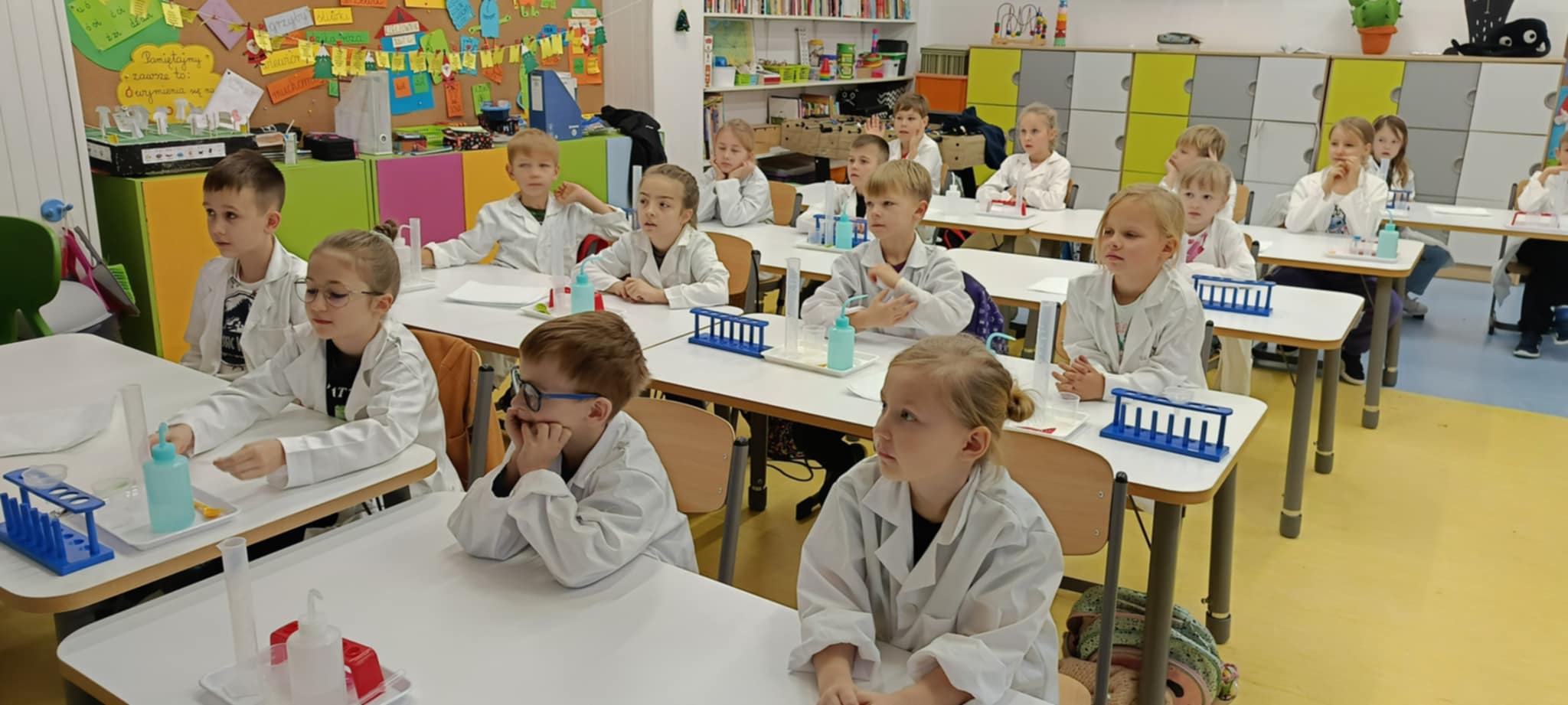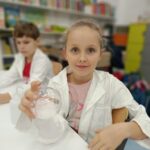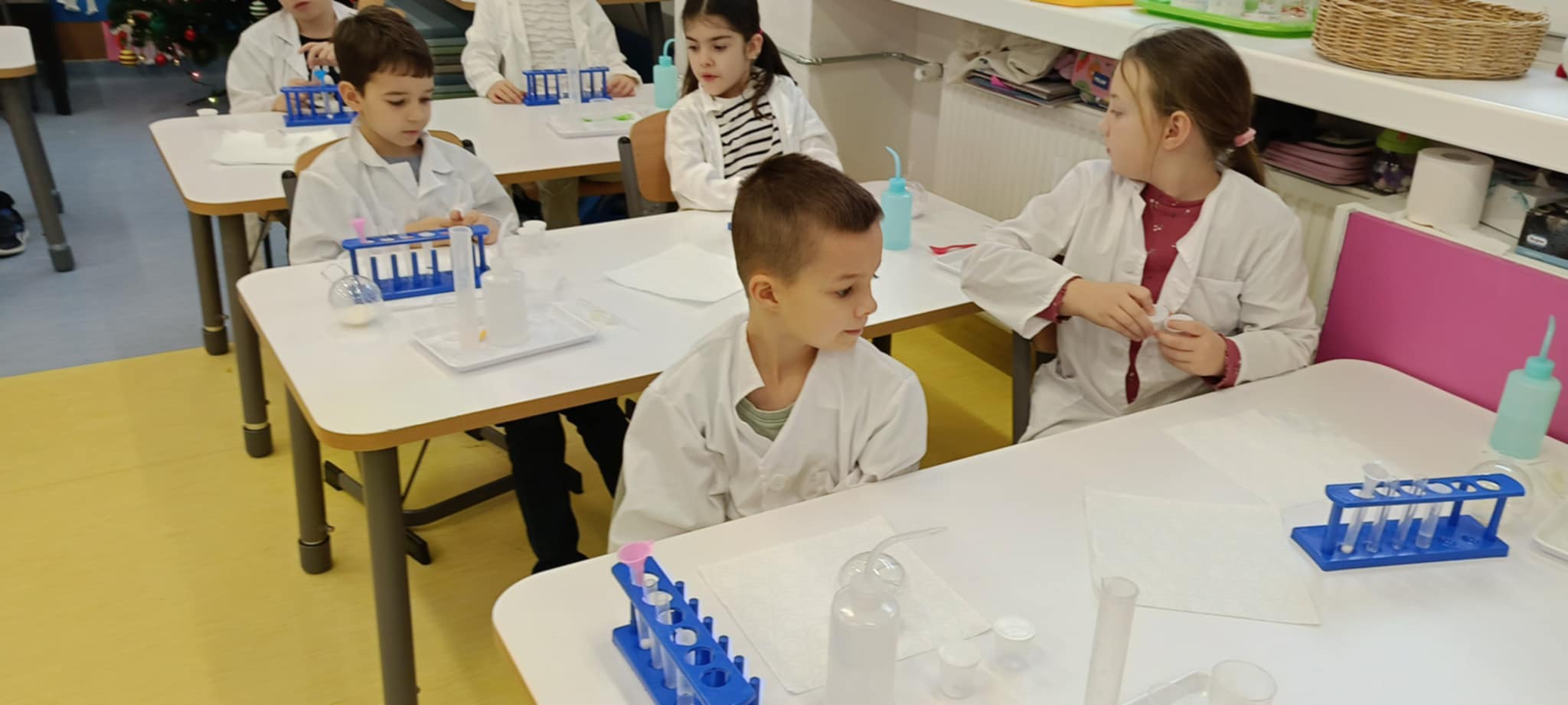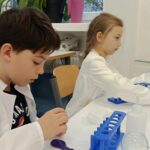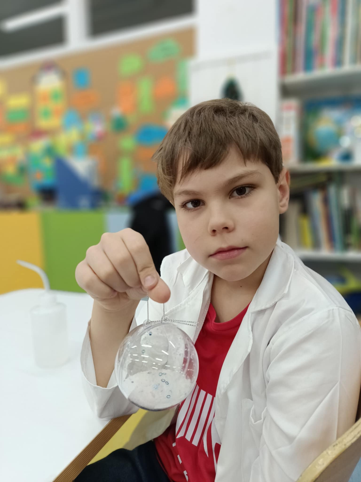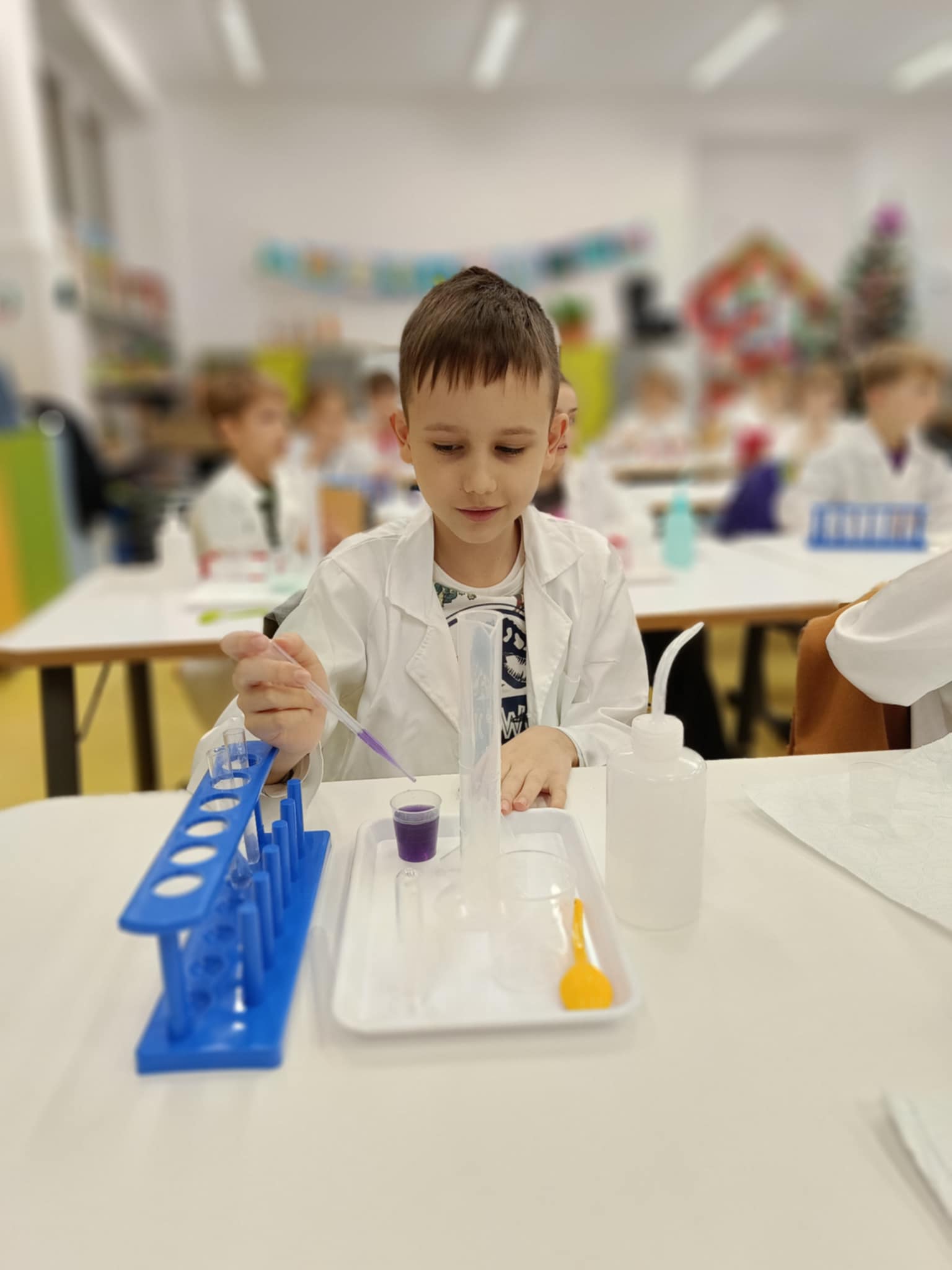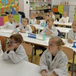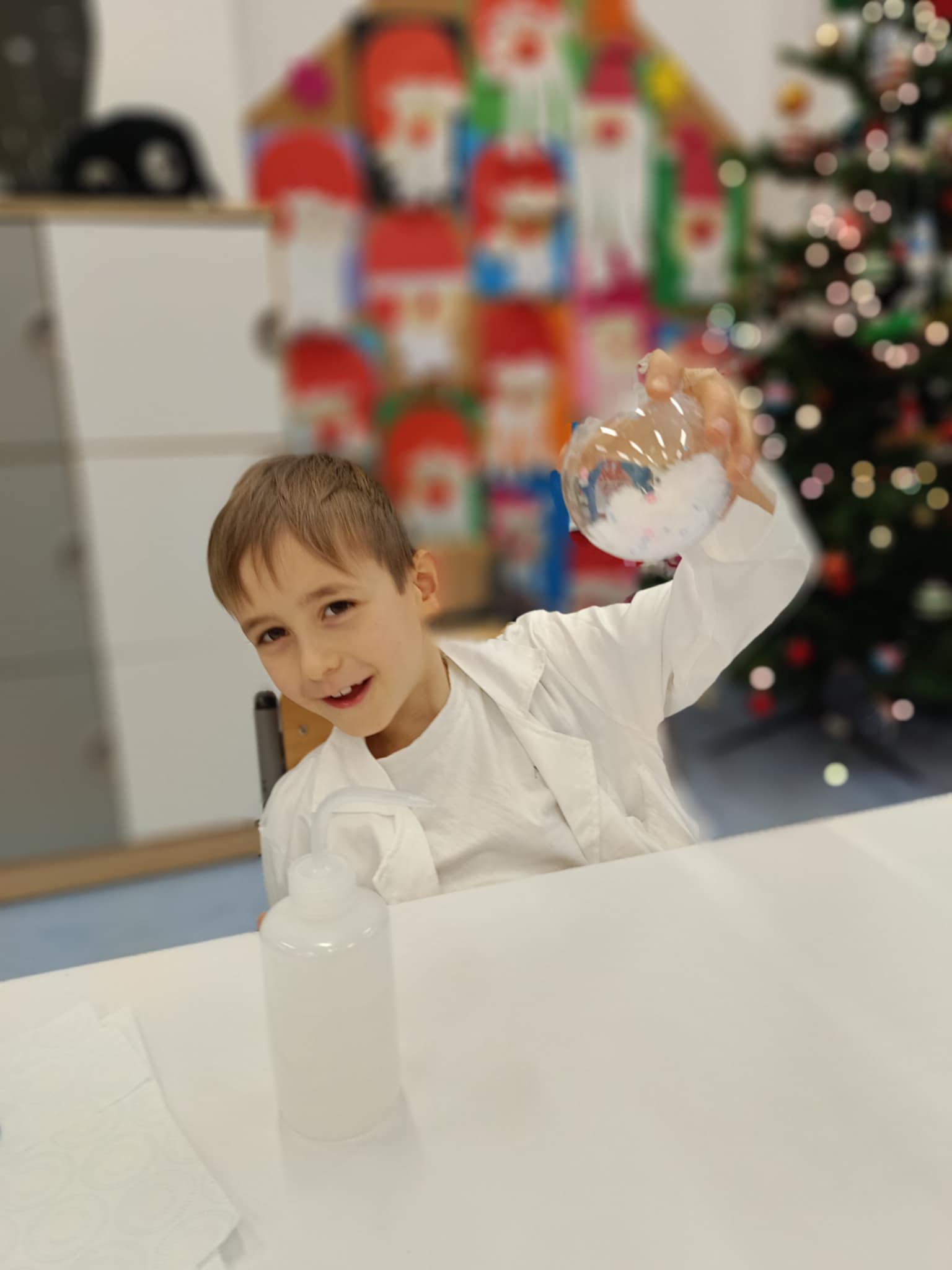 Tuż przed feriami mieliśmy okazję wziąć udział w kolejnych warsztatach chemicznych, tym razem związanych z zimą i okresem świątecznym. Po przygotowaniach stanowisk pracy, założeniu ubrań ochronnych przystąpiliśmy do eksperymentów. Każdy z nas miał swoje probówki i odczynniki, które posłużyły do wykonania kuli śnieżnej, elfowych eliksirów oraz magicznego balonika. Zaangażowanie małych chemików było ogromne, a zajęcia wzbogaciły nas dużą dawką wiedzy, umiejętności cierpliwości. Warsztaty poprowadziła pani Paula Kubicka, która z zawodu jest chemikiem i dzieli się swoją pasją z najmłodszymi uczniami. Bardzo dziękujemy!