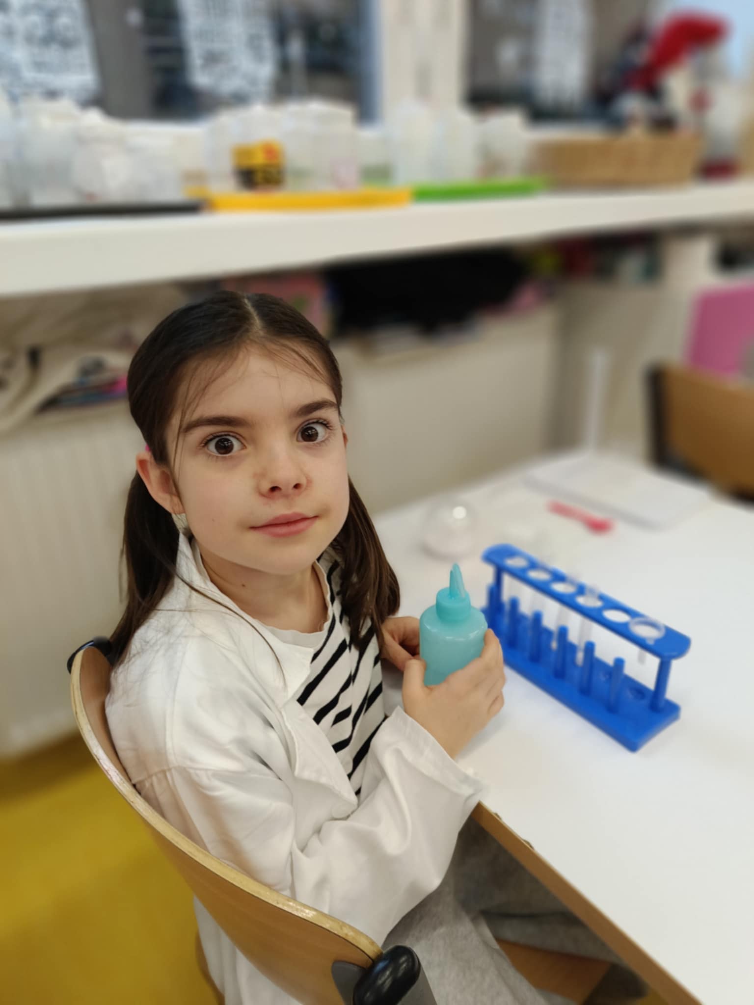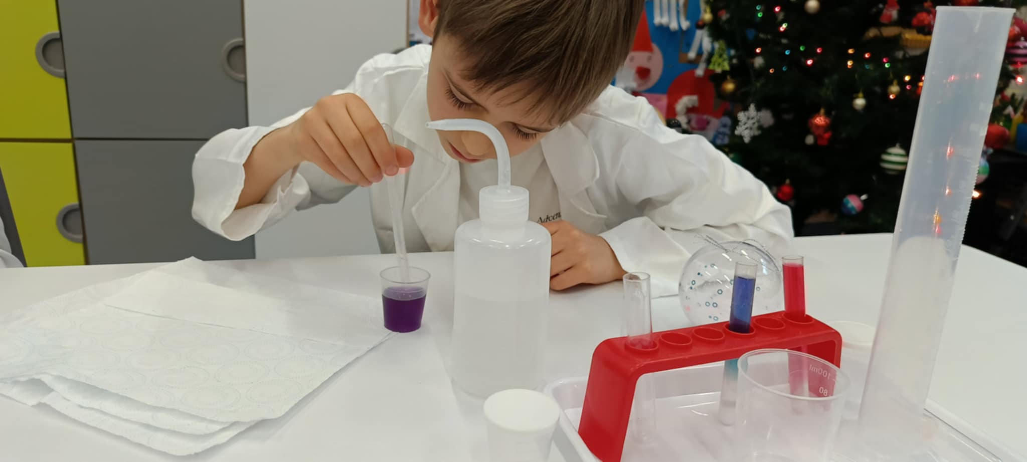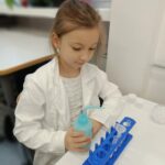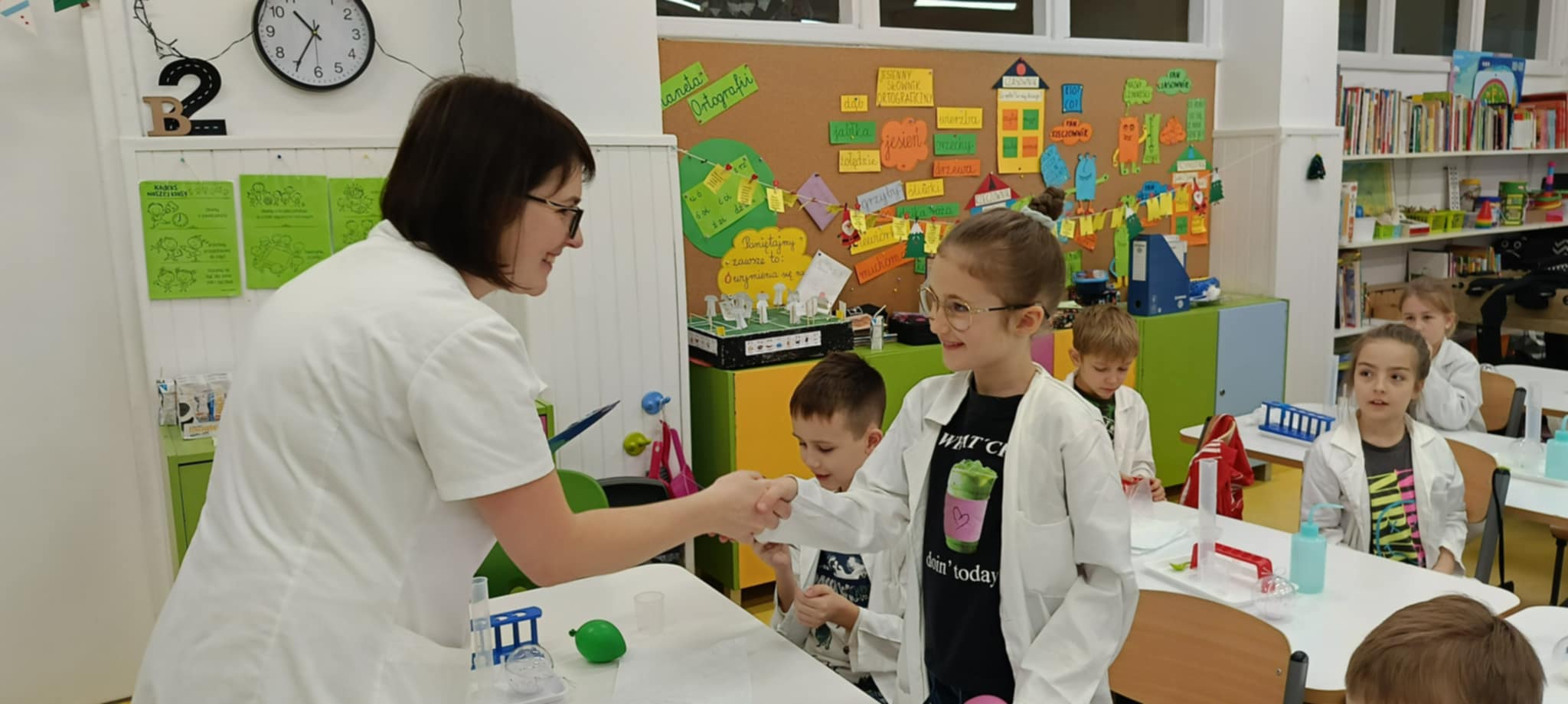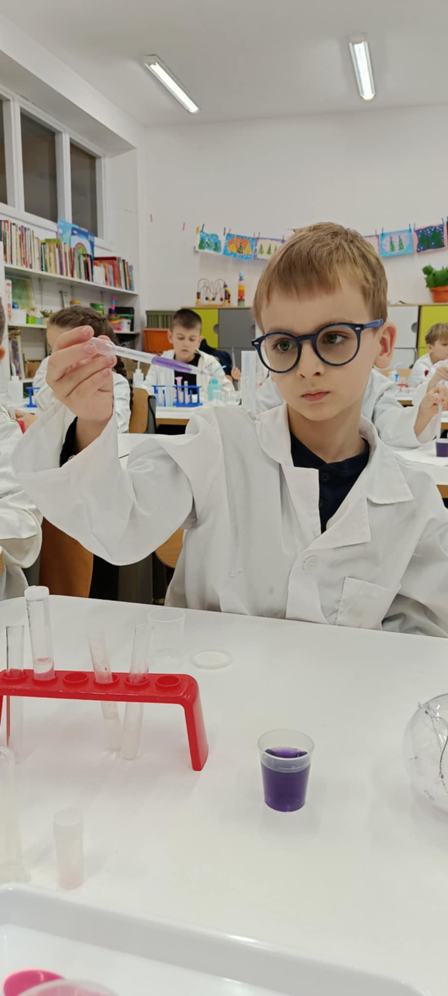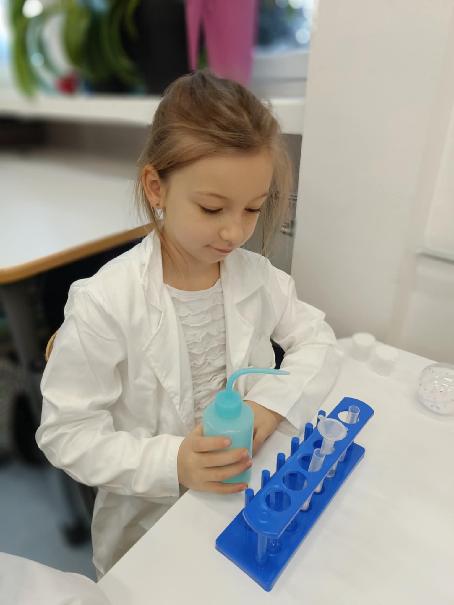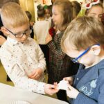 Tuż przed feriami mieliśmy okazję wziąć udział w kolejnych warsztatach chemicznych, tym razem związanych z zimą i okresem świątecznym. Po przygotowaniach stanowisk pracy, założeniu ubrań ochronnych przystąpiliśmy do eksperymentów. Każdy z nas miał swoje probówki i odczynniki, które posłużyły do wykonania kuli śnieżnej, elfowych eliksirów oraz magicznego balonika. Zaangażowanie małych chemików było ogromne, a zajęcia wzbogaciły nas dużą dawką wiedzy, umiejętności cierpliwości. Warsztaty poprowadziła pani Paula Kubicka, która z zawodu jest chemikiem i dzieli się swoją pasją z najmłodszymi uczniami. Bardzo dziękujemy!