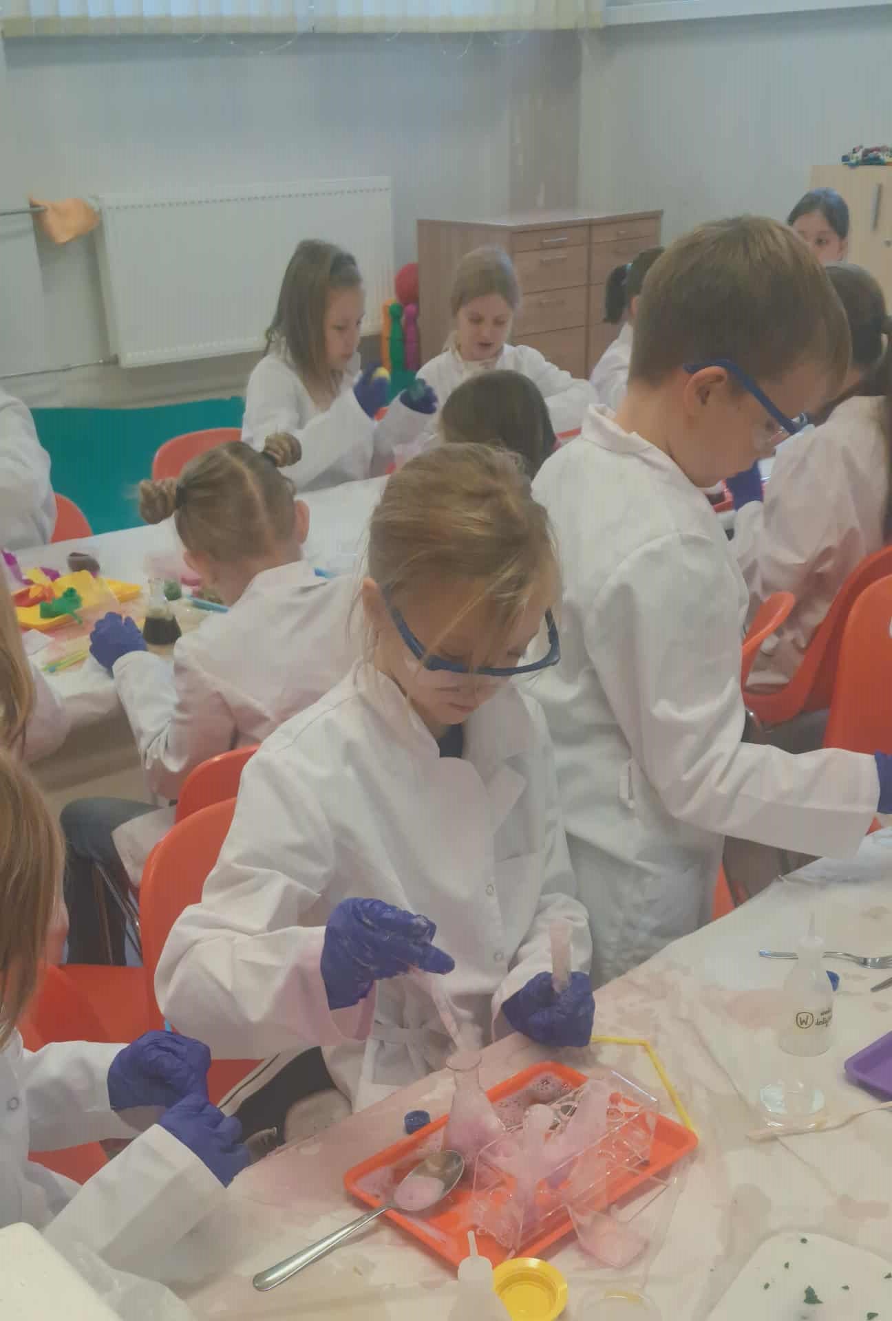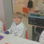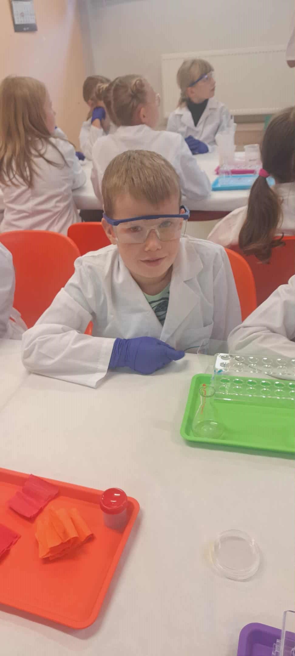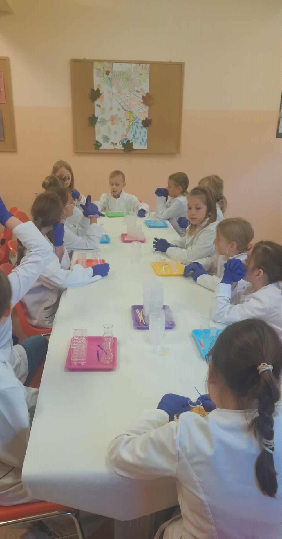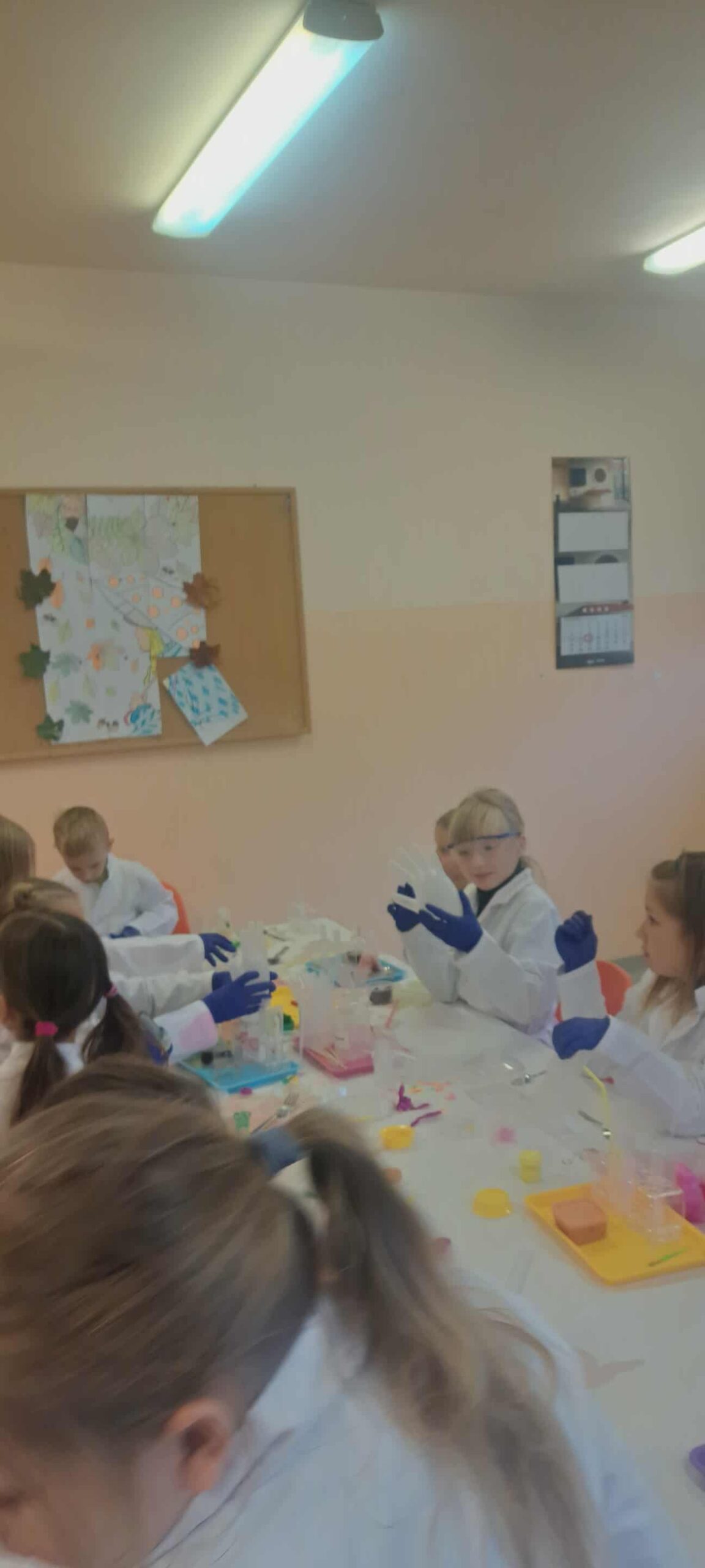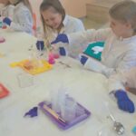 Na zakończenie miesiąca uczestniczyliśmy w warsztatach chemicznych, które były prawdziwym hitem! Dowiedzieliśmy się, czym jest suchy lód, jakie ma właściwości, a potem… zaczęły dziać się cuda: woda „dymiła” jak w bajce, kolory zmieniały się jak za dotknięciem czarodziejskiej różdżki, nadmuchiwaliśmy balony z rękawiczek, które same się rozszerzały dzięki dwutlenkowi węgla! Było jak w laboratorium czarodzieja – magicznie, naukowo i bardzo ciekawie! To był niesamowicie aktywny październik! Uczyliśmy się przez działanie, twórczość i zabawę – tak właśnie lubimy zdobywać wiedzę. Przed nami kolejne jesienne przygody!