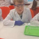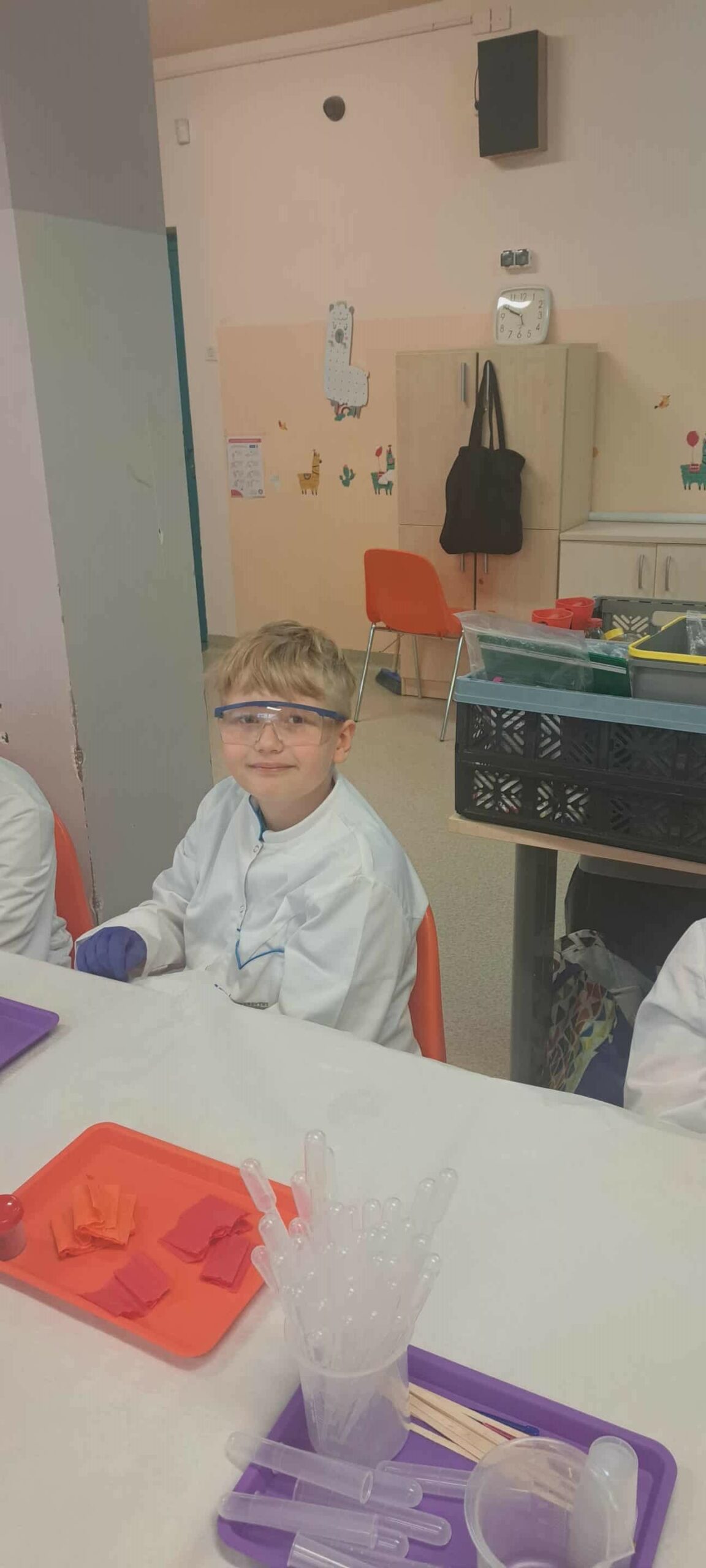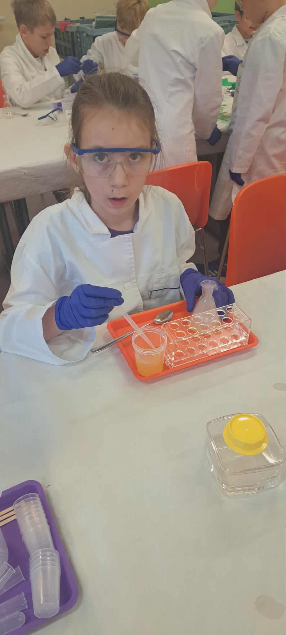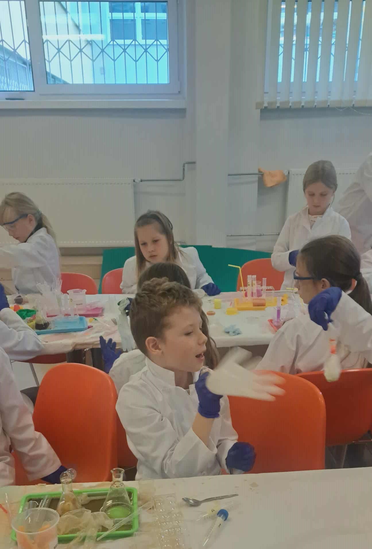 Na zakończenie miesiąca uczestniczyliśmy w warsztatach chemicznych, które były prawdziwym hitem! Dowiedzieliśmy się, czym jest suchy lód, jakie ma właściwości, a potem… zaczęły dziać się cuda: woda „dymiła” jak w bajce, kolory zmieniały się jak za dotknięciem czarodziejskiej różdżki, nadmuchiwaliśmy balony z rękawiczek, które same się rozszerzały dzięki dwutlenkowi węgla! Było jak w laboratorium czarodzieja – magicznie, naukowo i bardzo ciekawie! To był niesamowicie aktywny październik! Uczyliśmy się przez działanie, twórczość i zabawę – tak właśnie lubimy zdobywać wiedzę. Przed nami kolejne jesienne przygody!